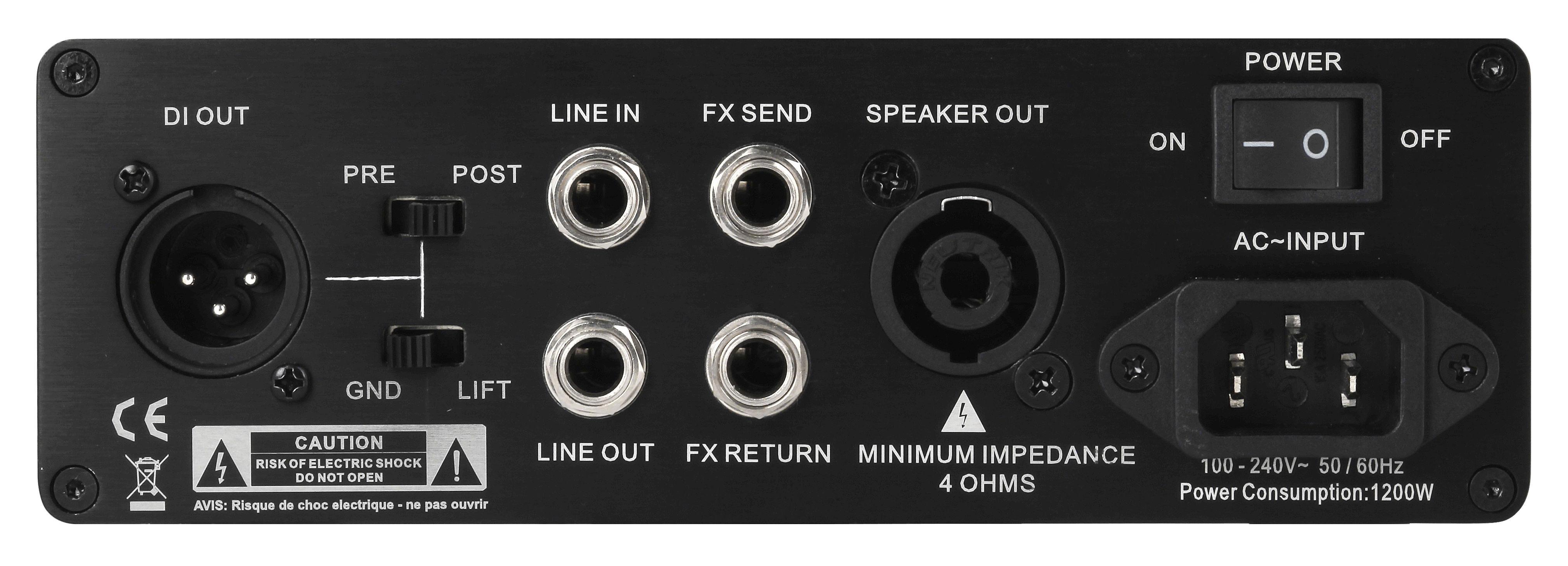 - rückseitige Anschlüsse für Line In (6,3 mm Monoklinke), Line Out (6,3 mm Monoklinke) DI Out (XLR), FX Send und Return (2 x 6,3 mm Mono-Kinke), Tuner Out (6,3 mm Mono-Klinke), Pre-Amp Out (6,3 mm Monoklinke), Speaker Out (Neutrik Speakon 2-pin), IEC Kaltgerätebuchse