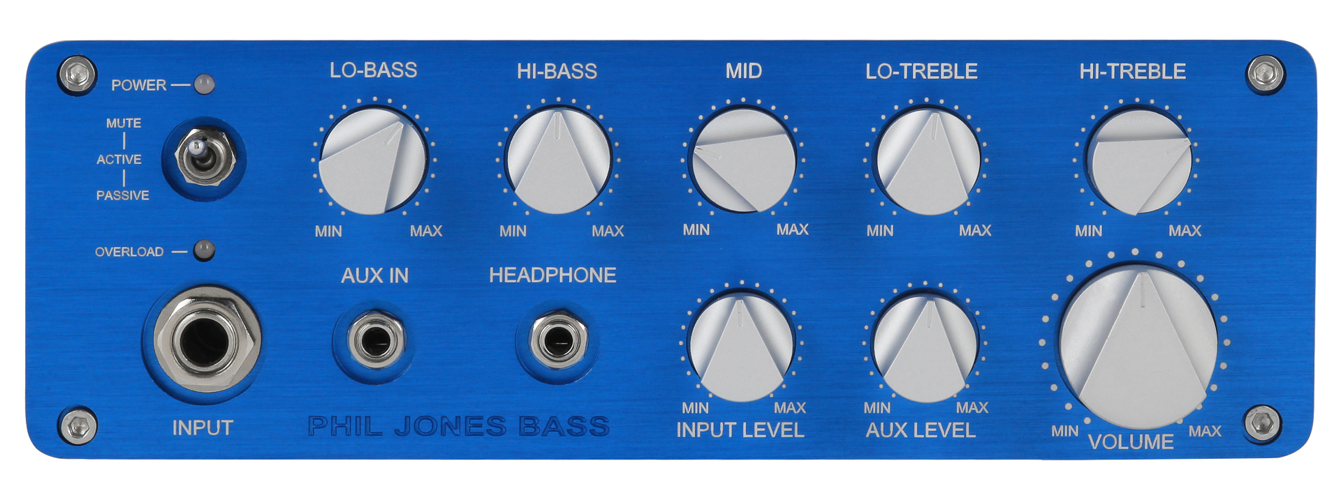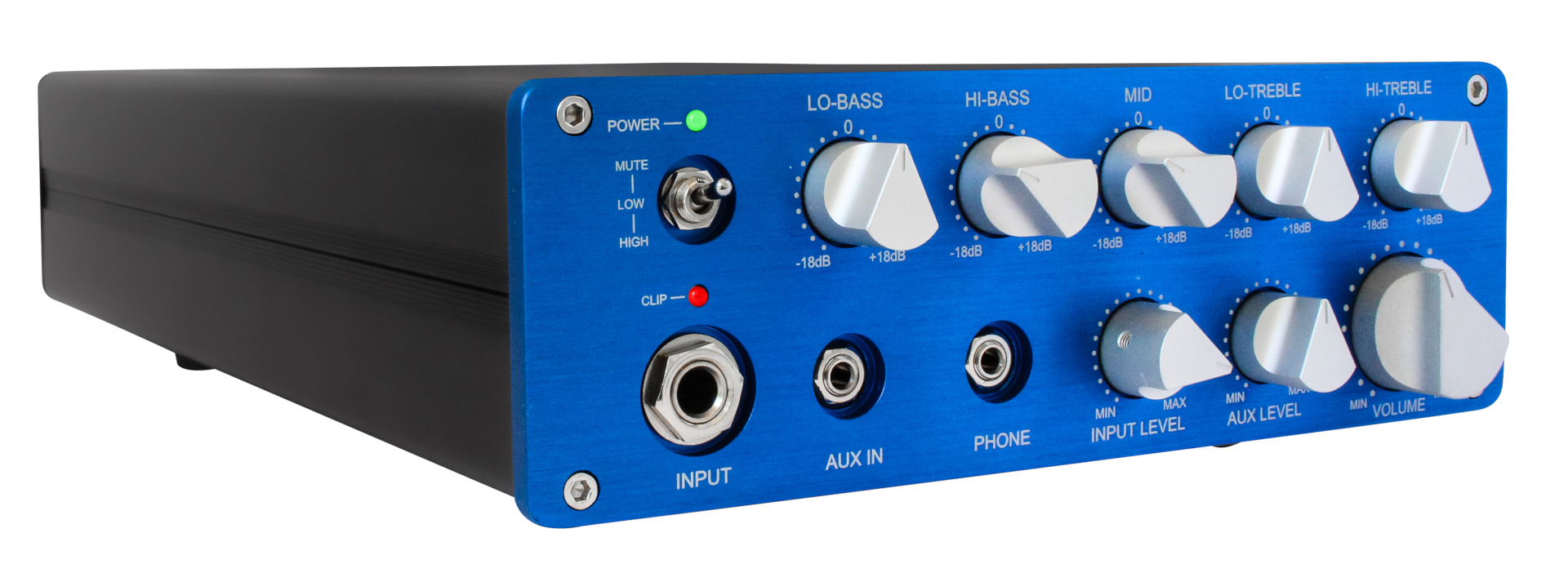 - front-seitige Regler für Lo-Bass, Hi-Bass, Mid, Lo-Treble, Hi-Treble, Input Level, Aux Level, Volume