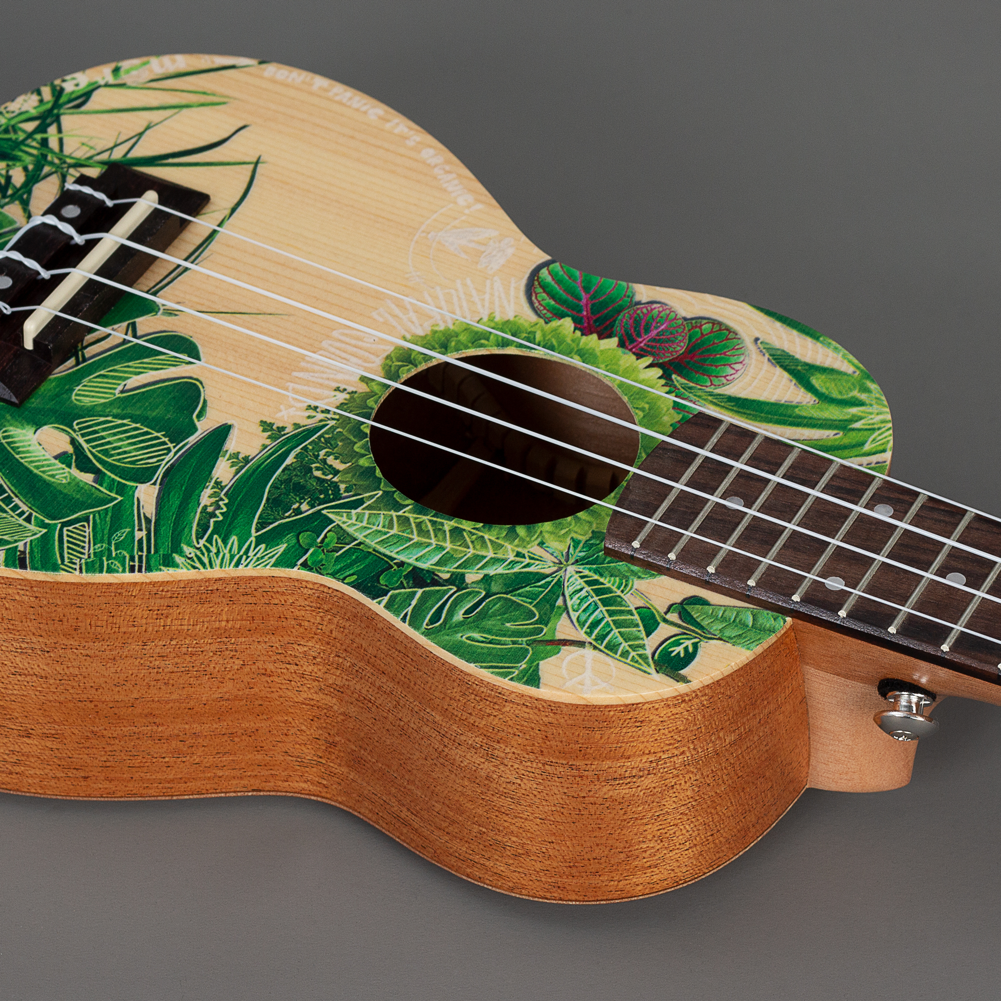 Die Leafy Ukulele überzeugt sofort von Anfang an durch die sehr gute Verarbeitung. Die Decke besteht aus massivem Fichtenholz. Als Deckenholz für Ukulelen sorgt Fichte für einen vollen Klang und ein kraftvolles Feedback. Da es etwas weicher ist, überträgt es Schwingungen leichter. Das edle Matt-Finish wurde speziell gewählt, um den Klang nicht zu beeinträchtigen. Die eingebauten Gurt Pins ermöglichen ein Anbringen von Ukulelegurten. Damit kann man den Komfort und die Beweglichkeit beim Spielen erhöhen.